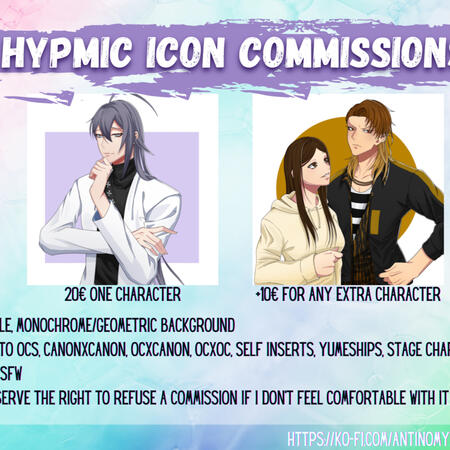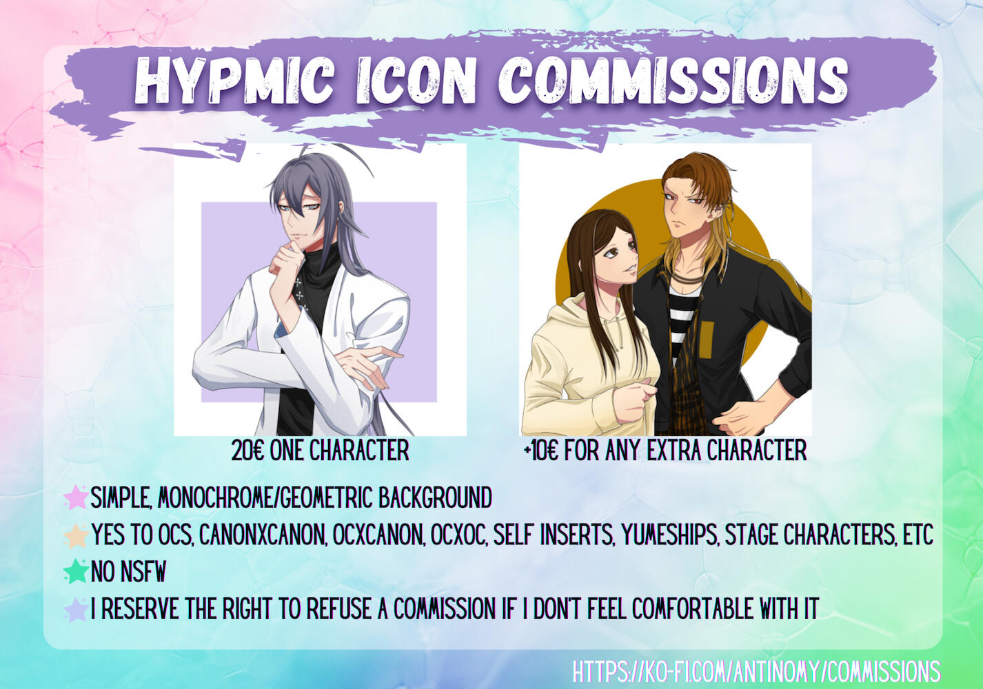 IF YOU'RE INTERESTED IN OTHER KINDS OF COMMISSIONS, DM ME! Twitter is best!SPECIAL PRICE: Hypmic icon commissions on ko-fi!