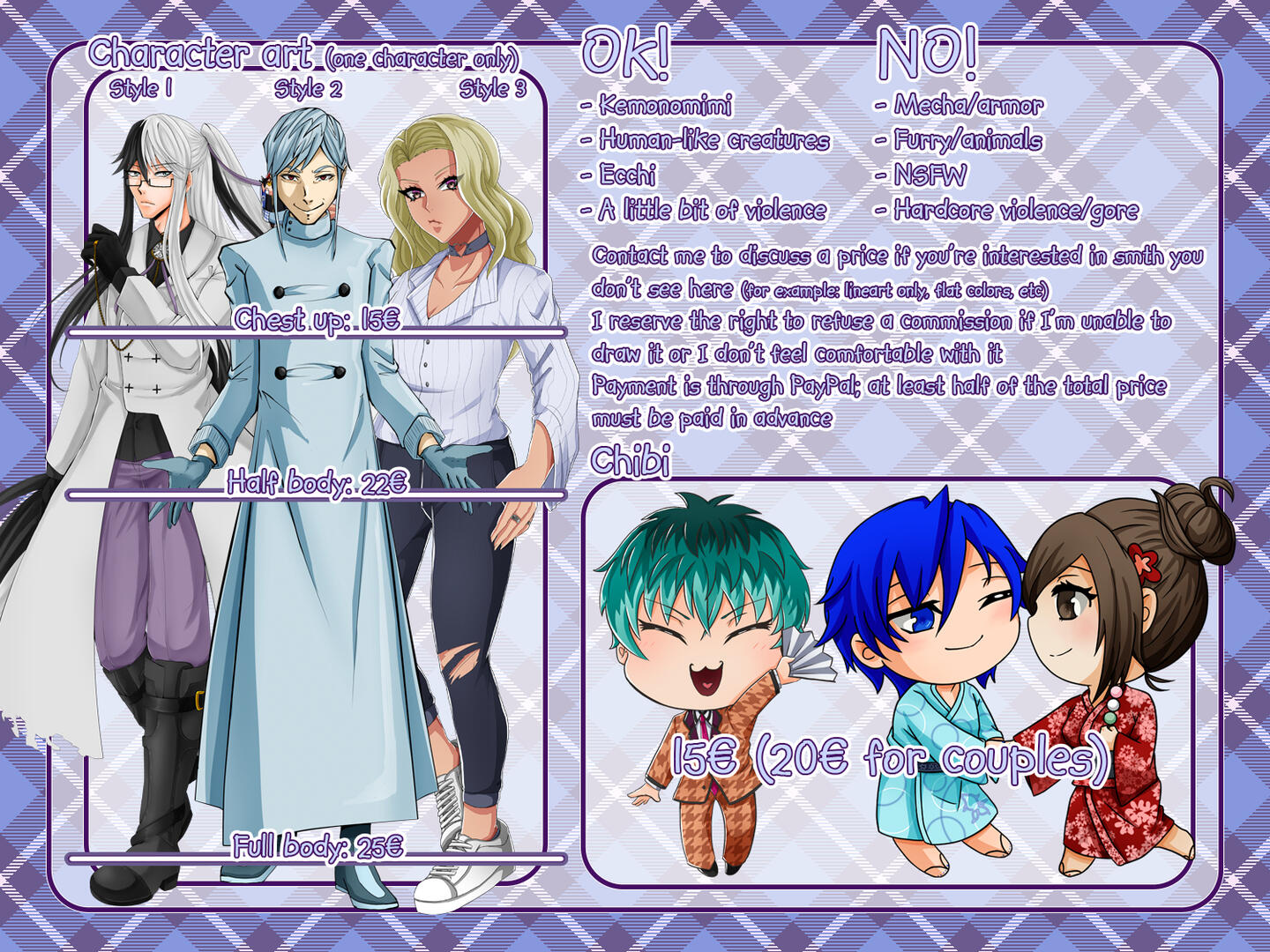 Canon characters, OCs, self inserts, you name it!Style 1 is my own; style 2 is Bungo Stray Dogs inspired, and style 3 is Hypmic inspired.Feel free to shoot me a message at @ReaRyuugu on twitter (don't be afraid to @ me directly if I don't answer after a while, twitter likes to eat up messages sometimes!) or send me a mail at [email protected]